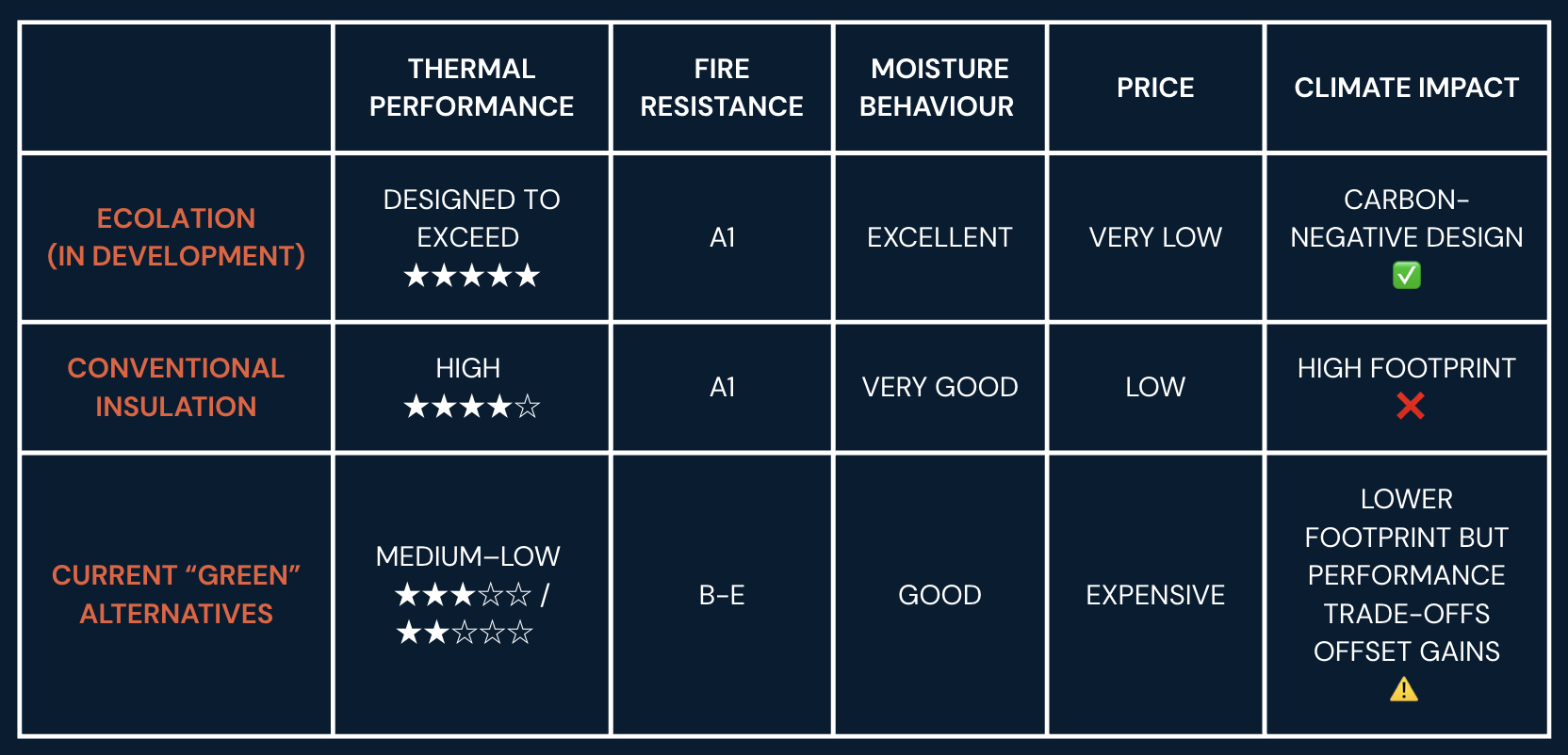 We are developing three product families built on the same core material, so that planners and installers can choose the format that best fits their project. All formats are designed to deliver high thermal performance, carbon-negative footprint and competitive cost compared to today’s market leader.